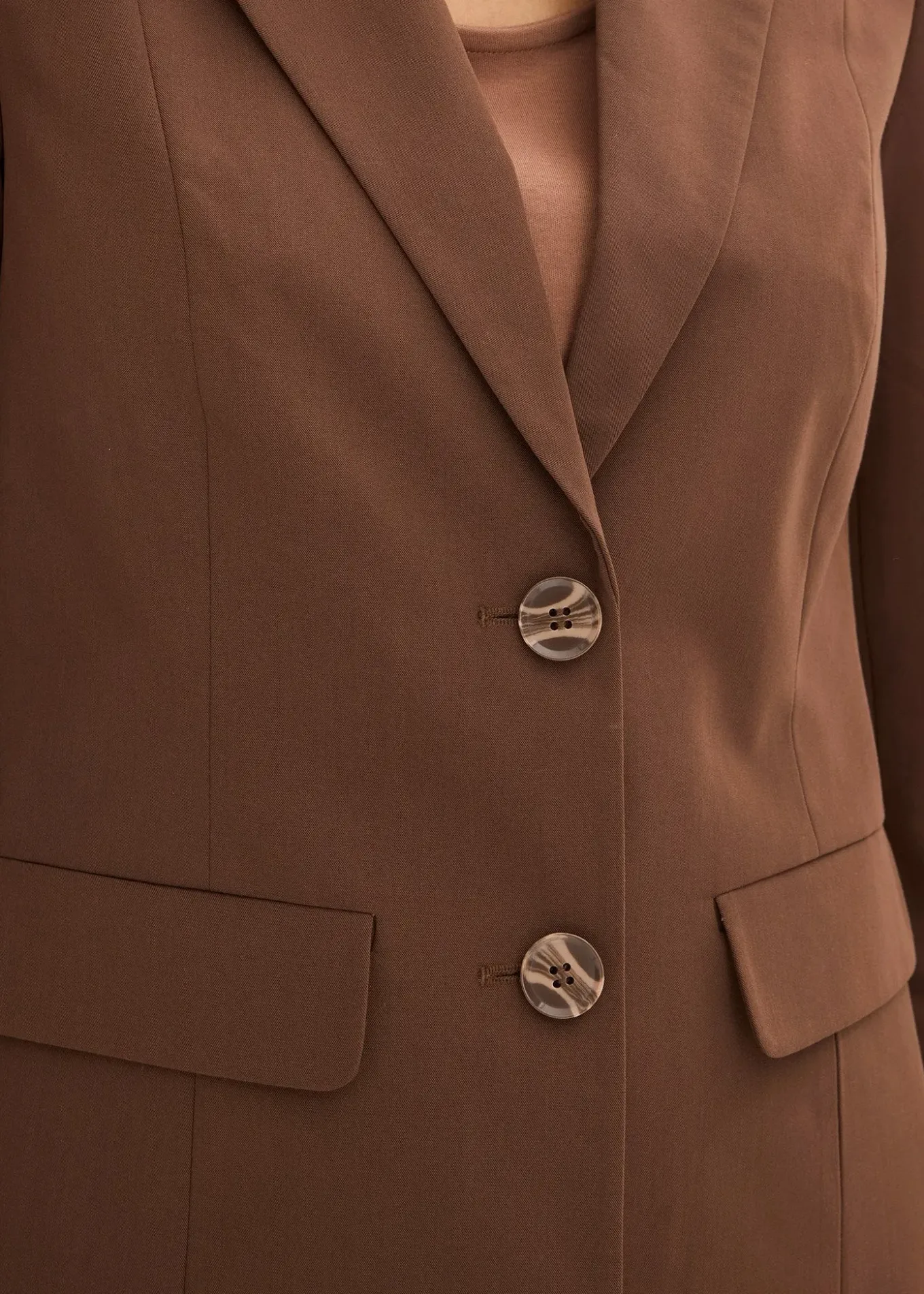 Tailleur pantalon élégant, classique et facile à associer. Avec boutons mode en aspect corne colorée pour un look original.