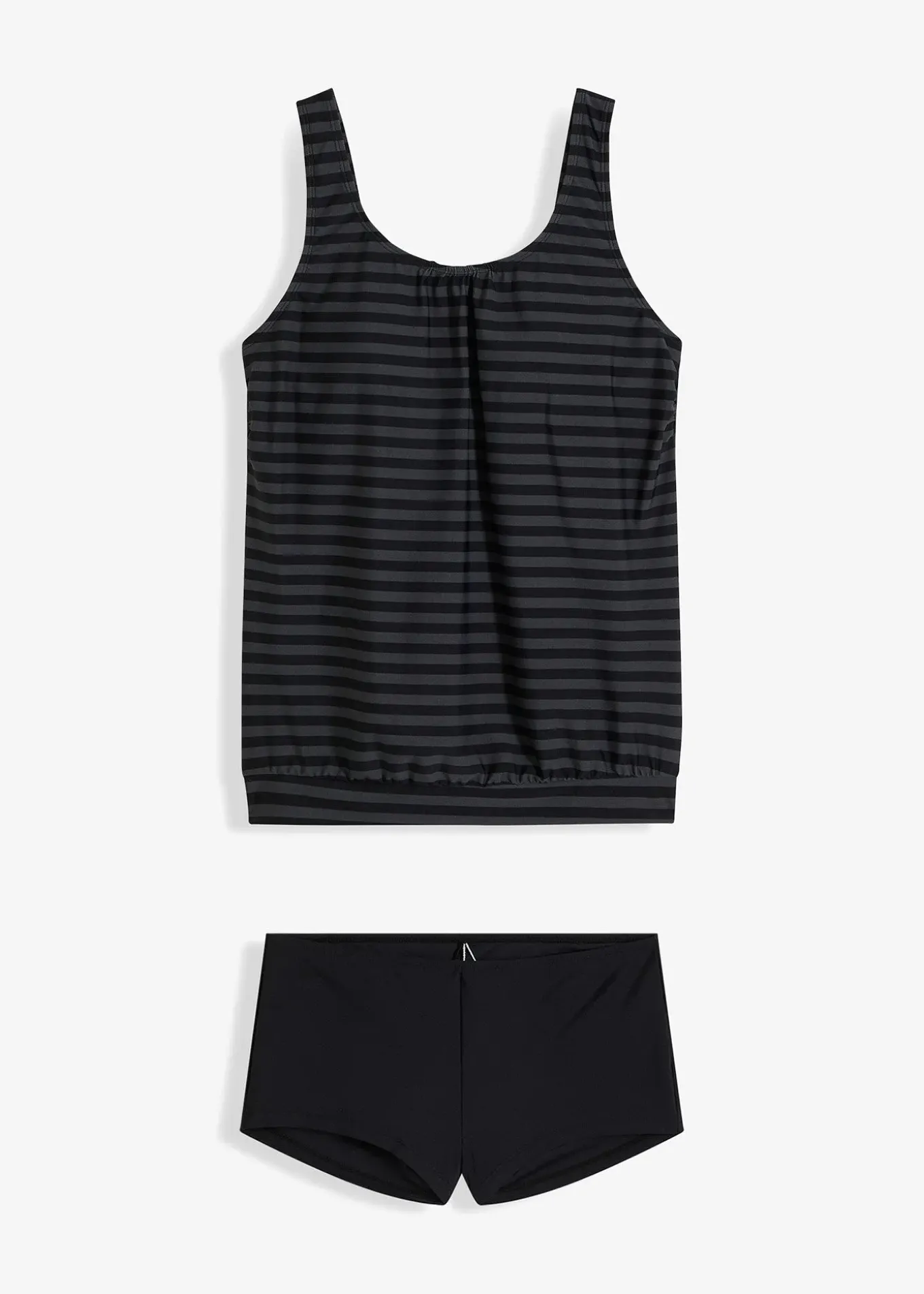 Ce superbe tankini de la collection bpc se distingue par une coupe plus large. Le haut style top est agrémenté de fronces autour de l’encolure ronde et d’un empiècement à la base. Une bande élastique sous poitrine procure du maintien. La doublure poitrine et les coques souples intégrées finalisent le top. Les bretelles ne sont pas réglables. Le haut de tankini de coupe flatteuse est complété d’un bas de bikini uni de forme shorty.