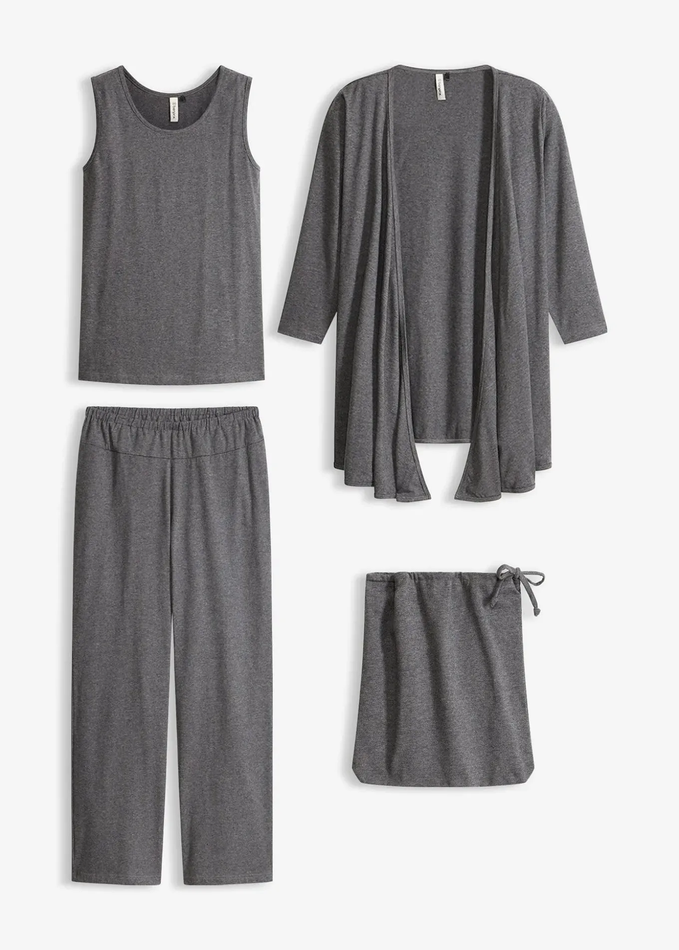 Ensemble 3 pièces composé d’un top, un gilet et un pantalon. Gilet à manches 3/4 à nouer, pantalon ample, long. env. 74 cm, lavage machine.