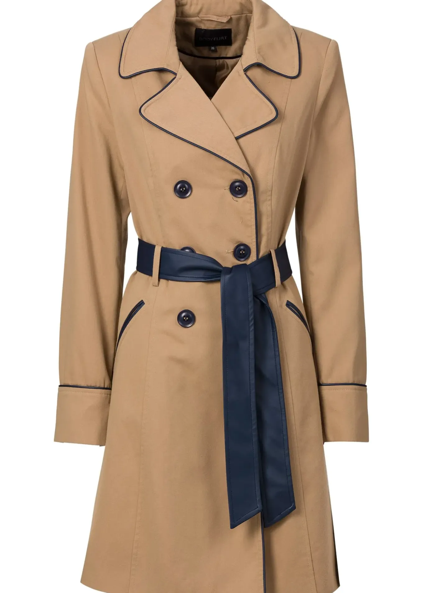 Trench-coat féminin avec col à revers et double rangée de boutons. Tape-à-l’œil : les applications contrastantes. Le trench a une forme évasée et se cintre à la taille par une ceinture à nouer. Long. env. 90 cm.