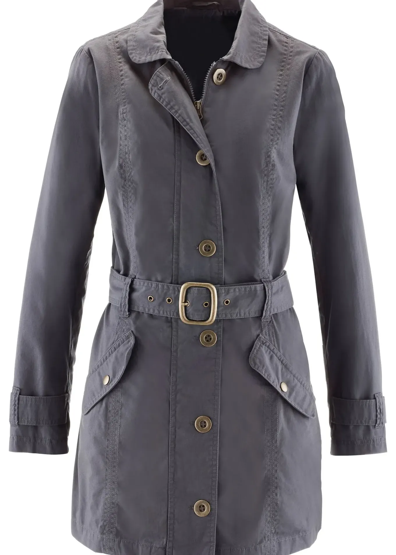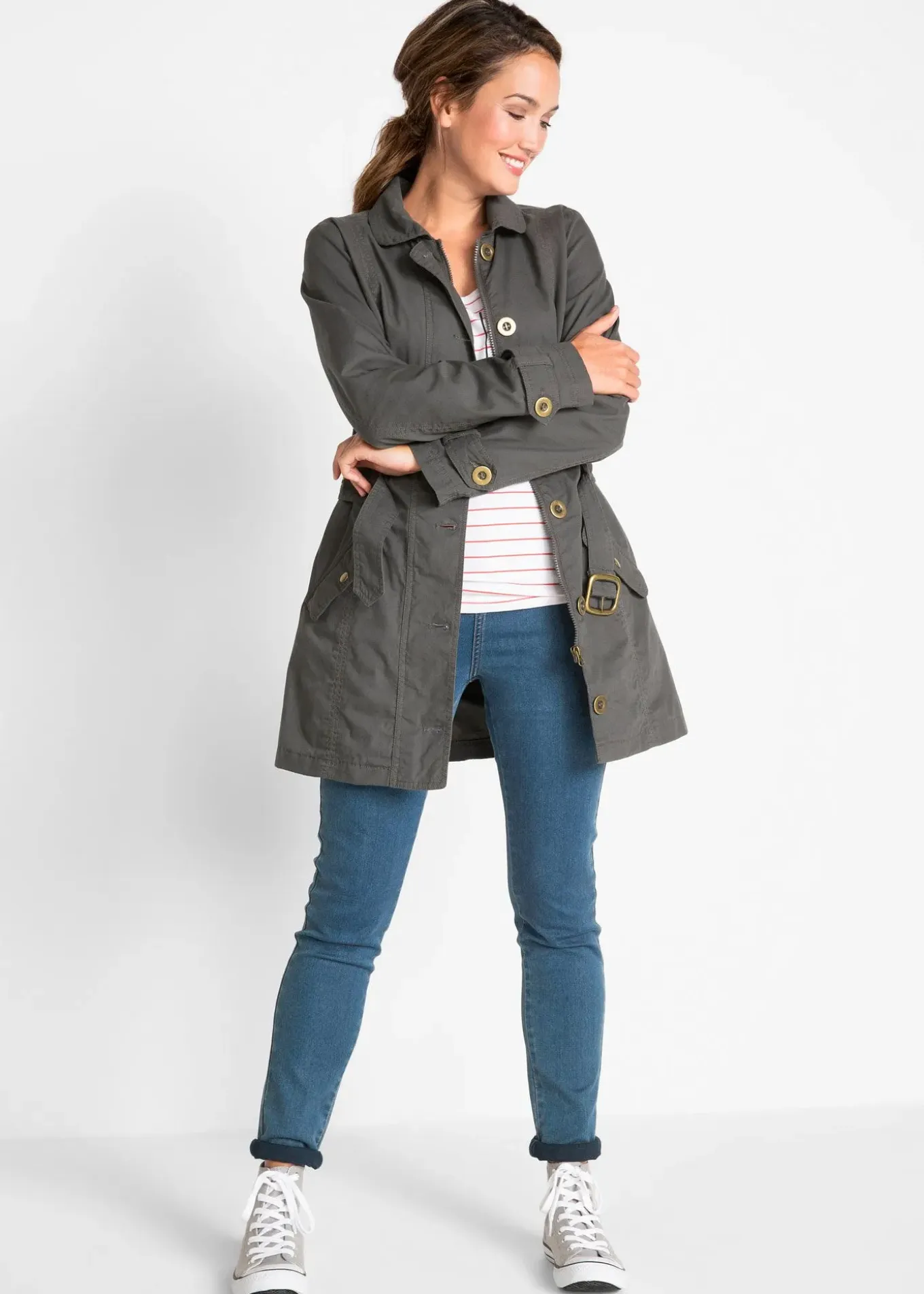Trench élégant décliné dans une palette de coloris actuels. Coutures d’empiècement sur le devant, poches à rabat et patte boutonnée aux poignets, fermeture zippée sous rabat boutonné, coupe près du corps, long. env. 82 cm, lavage machine.