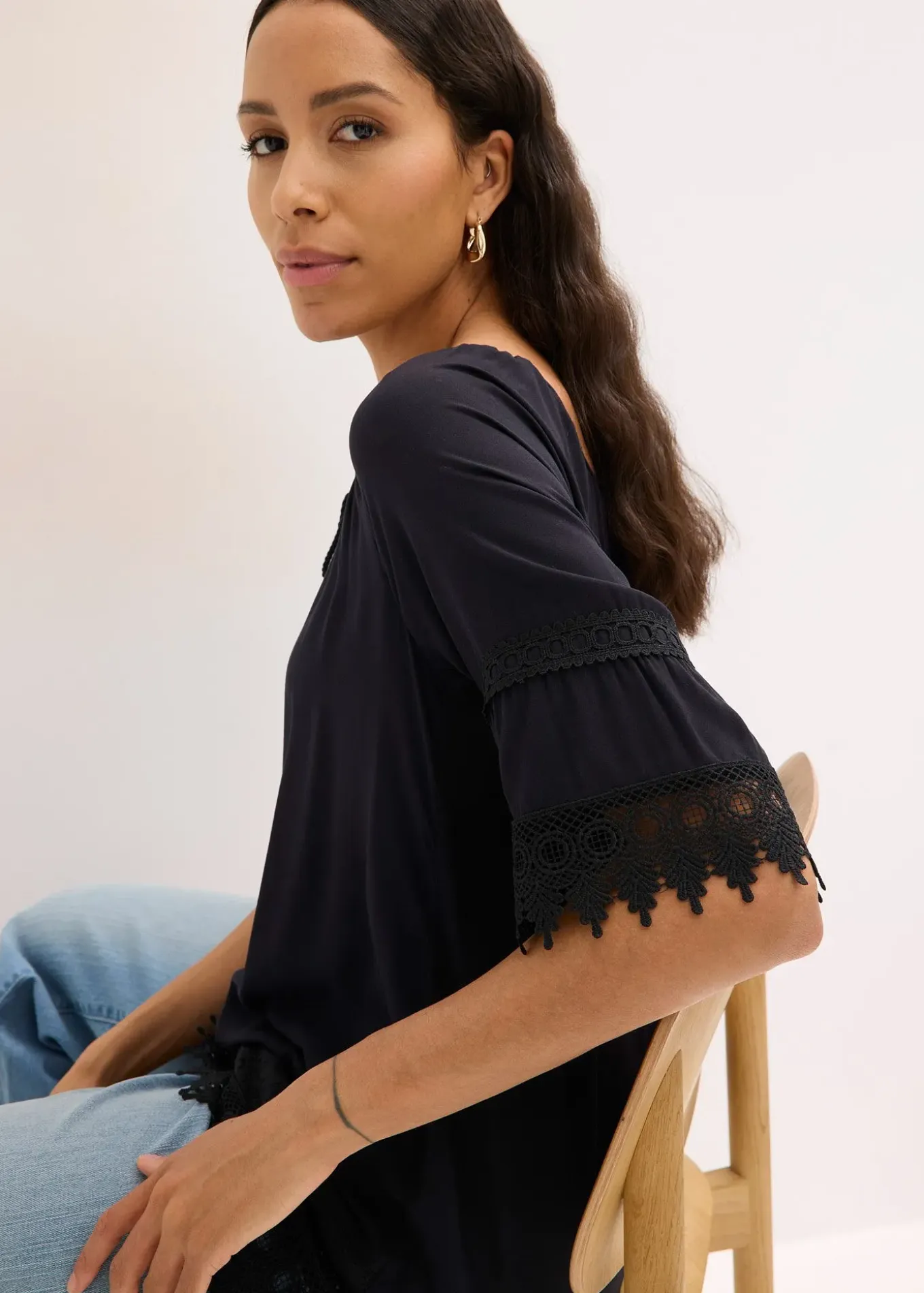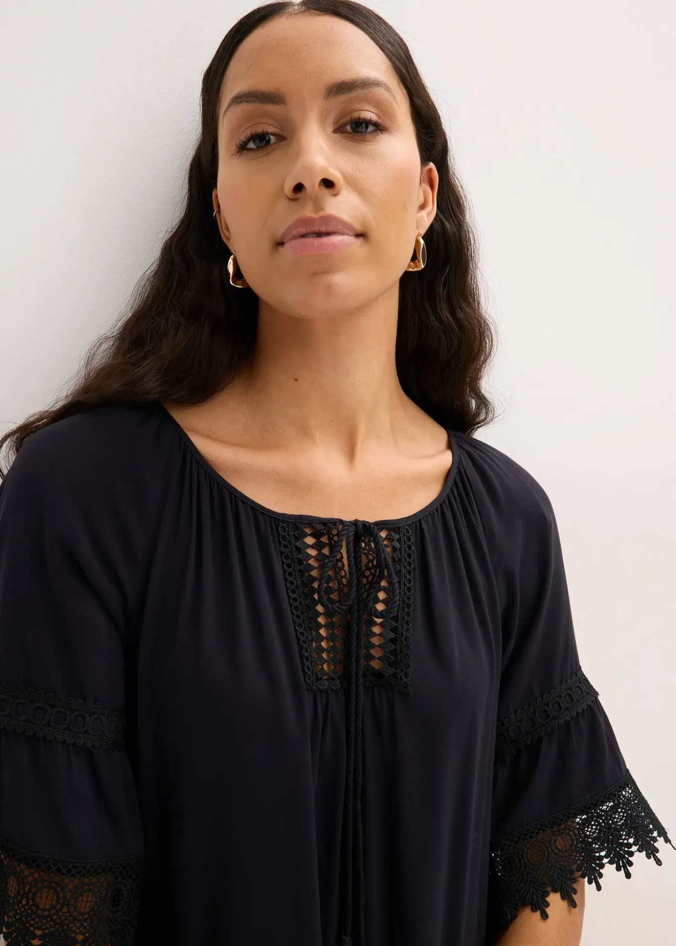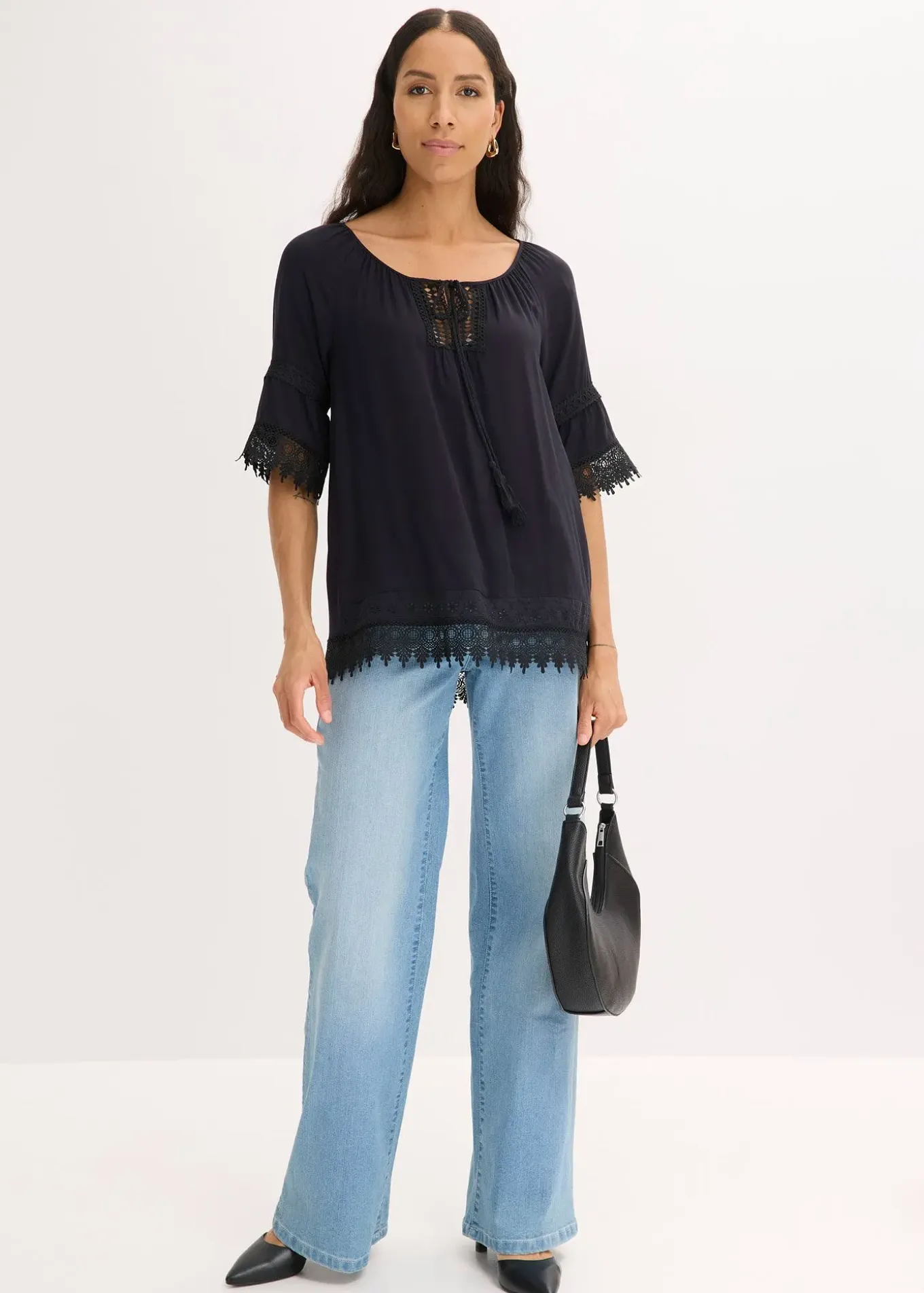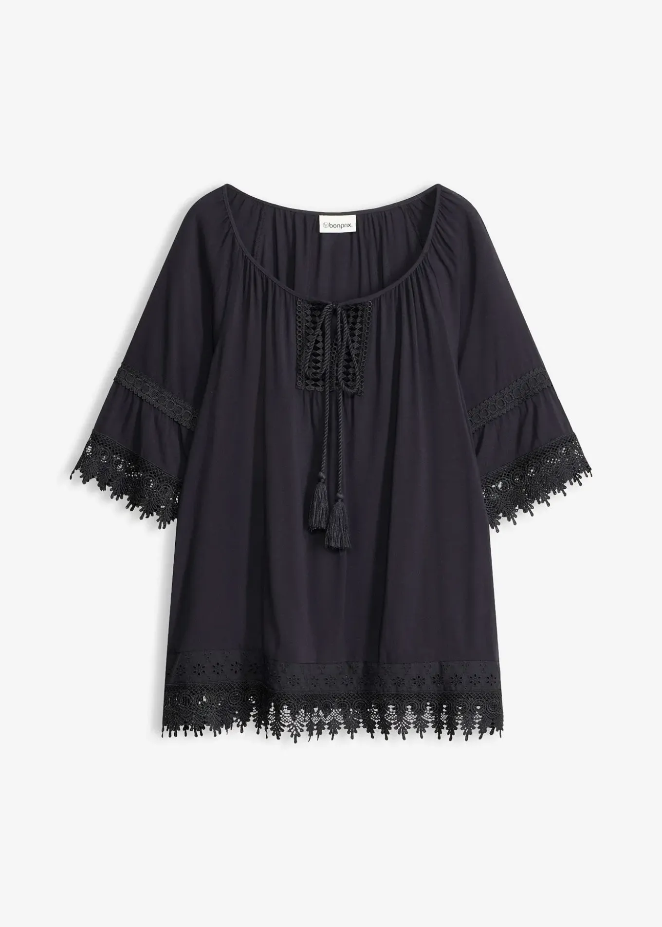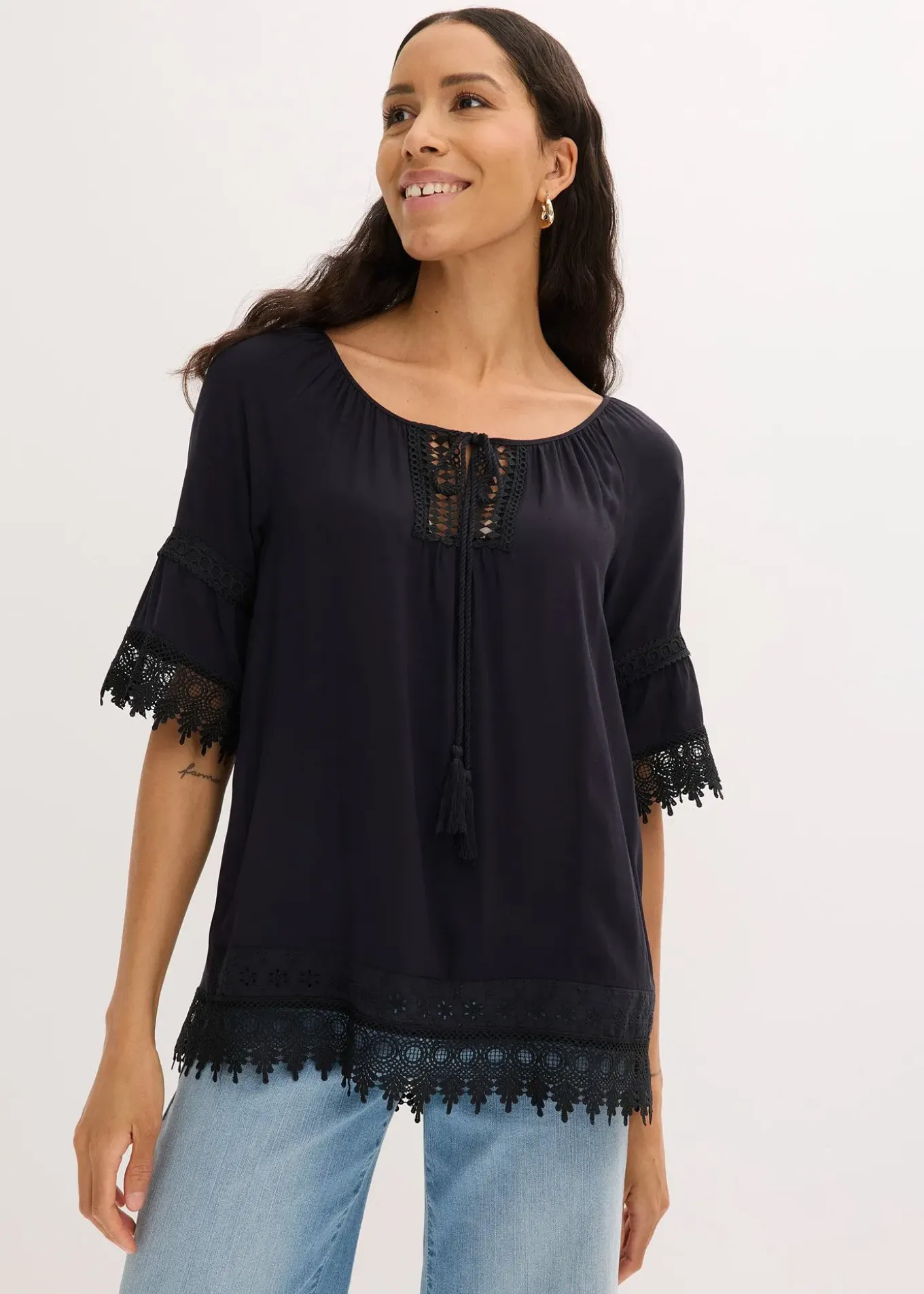 Tunique à dentelle et volants de BODYFLIRT, coupe droite et ample, encolure ronde et dégagée, empiècement en dentelle crochetée.