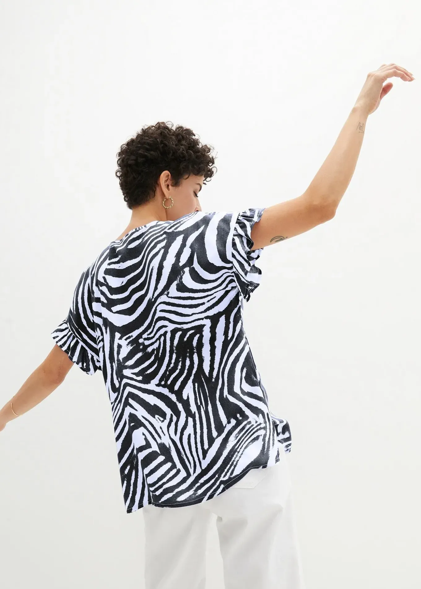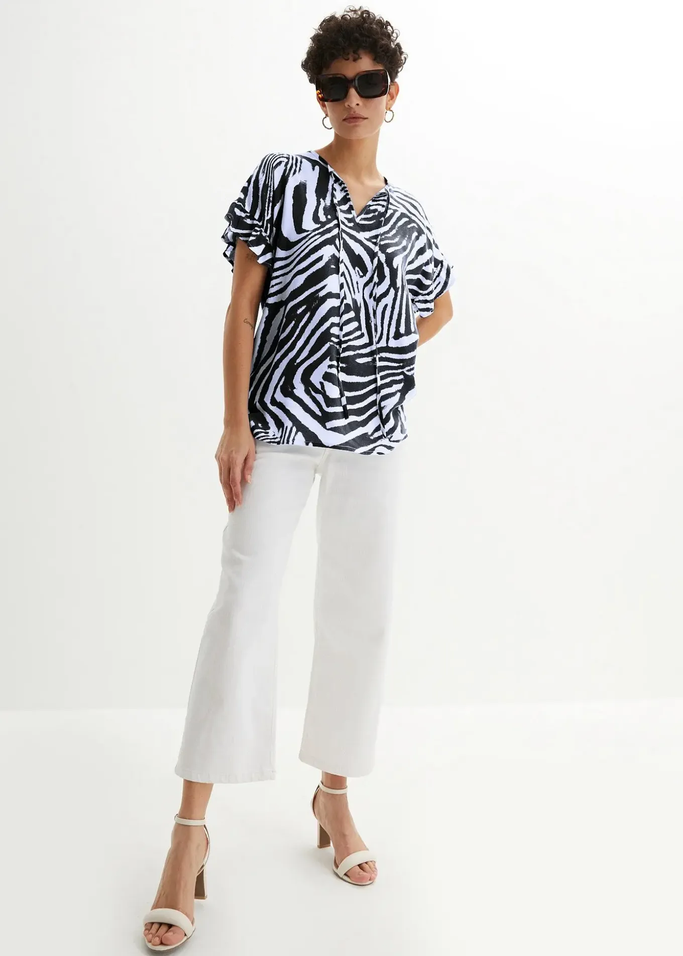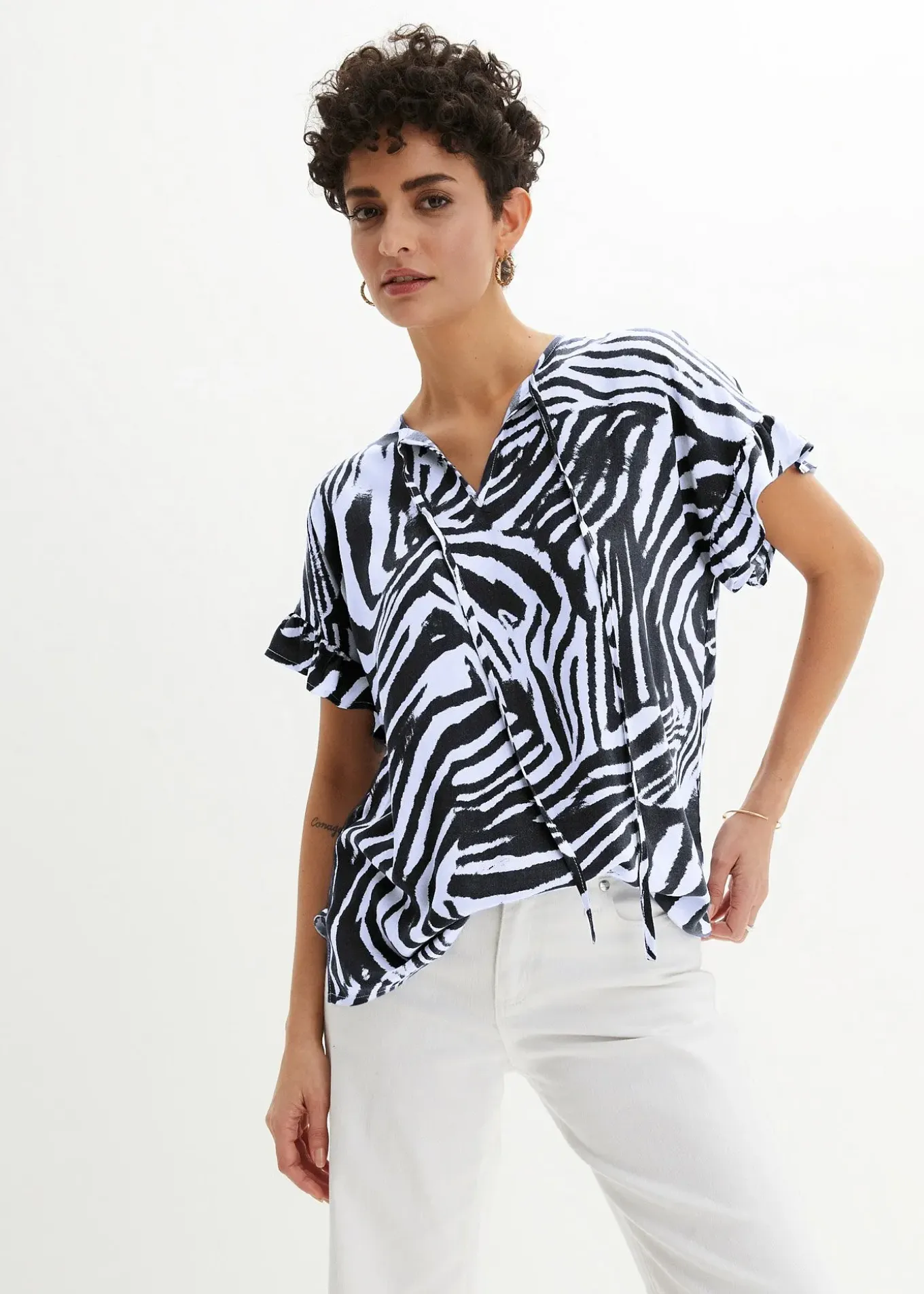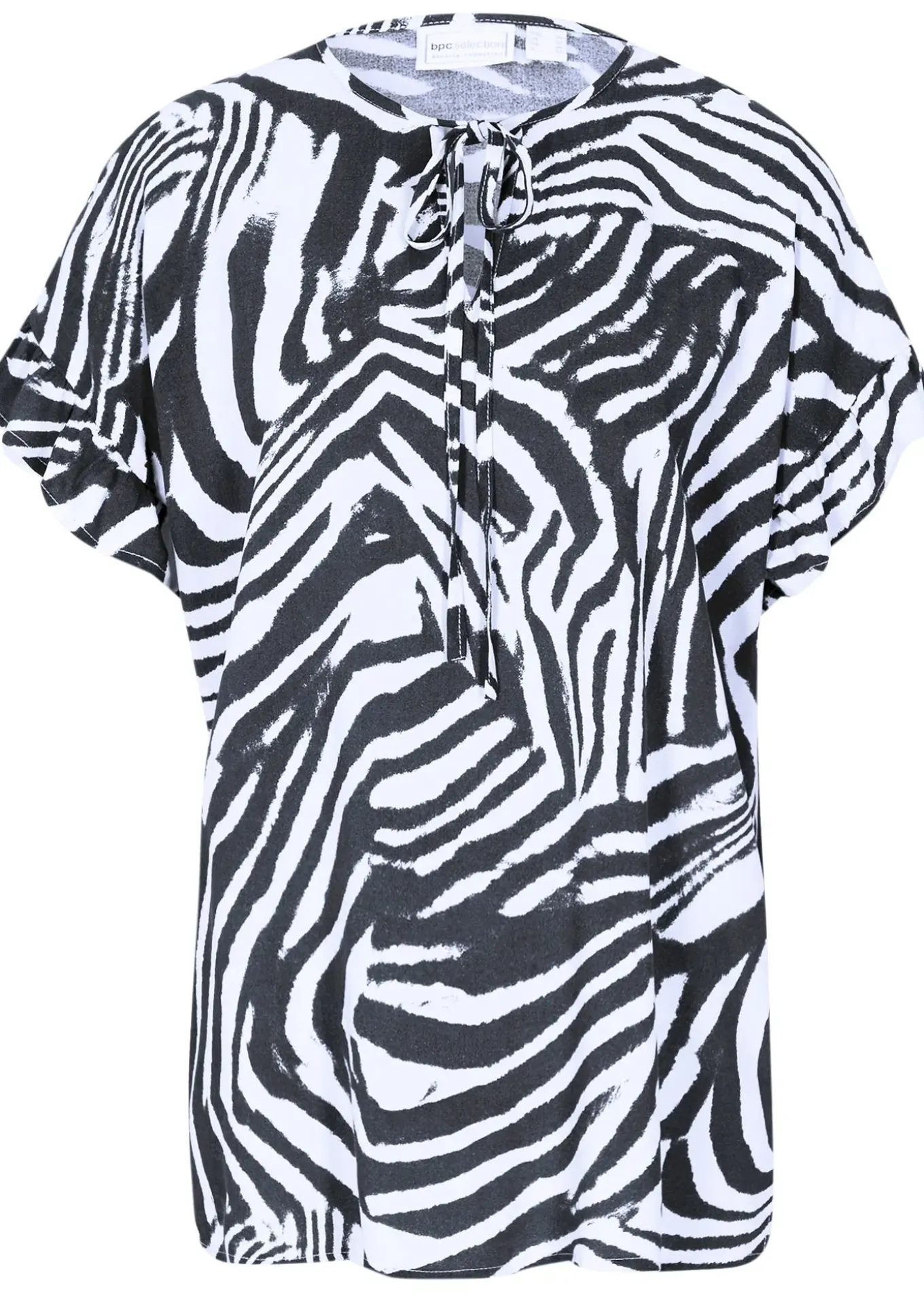 Jolie tunique ample à motif et liens à nouer sur le décolleté