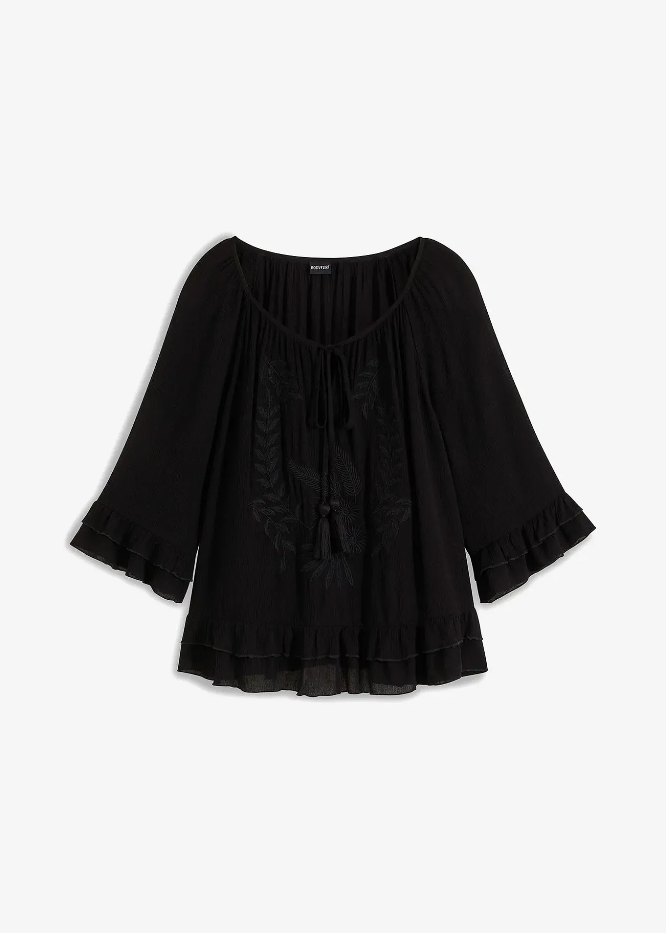 Jolie blouse stylée façon bohème avec broderie décorative ton sur ton. Les volants à la base ajoutent une touche d’originalité. Avec encolure ronde et liens à nouer.