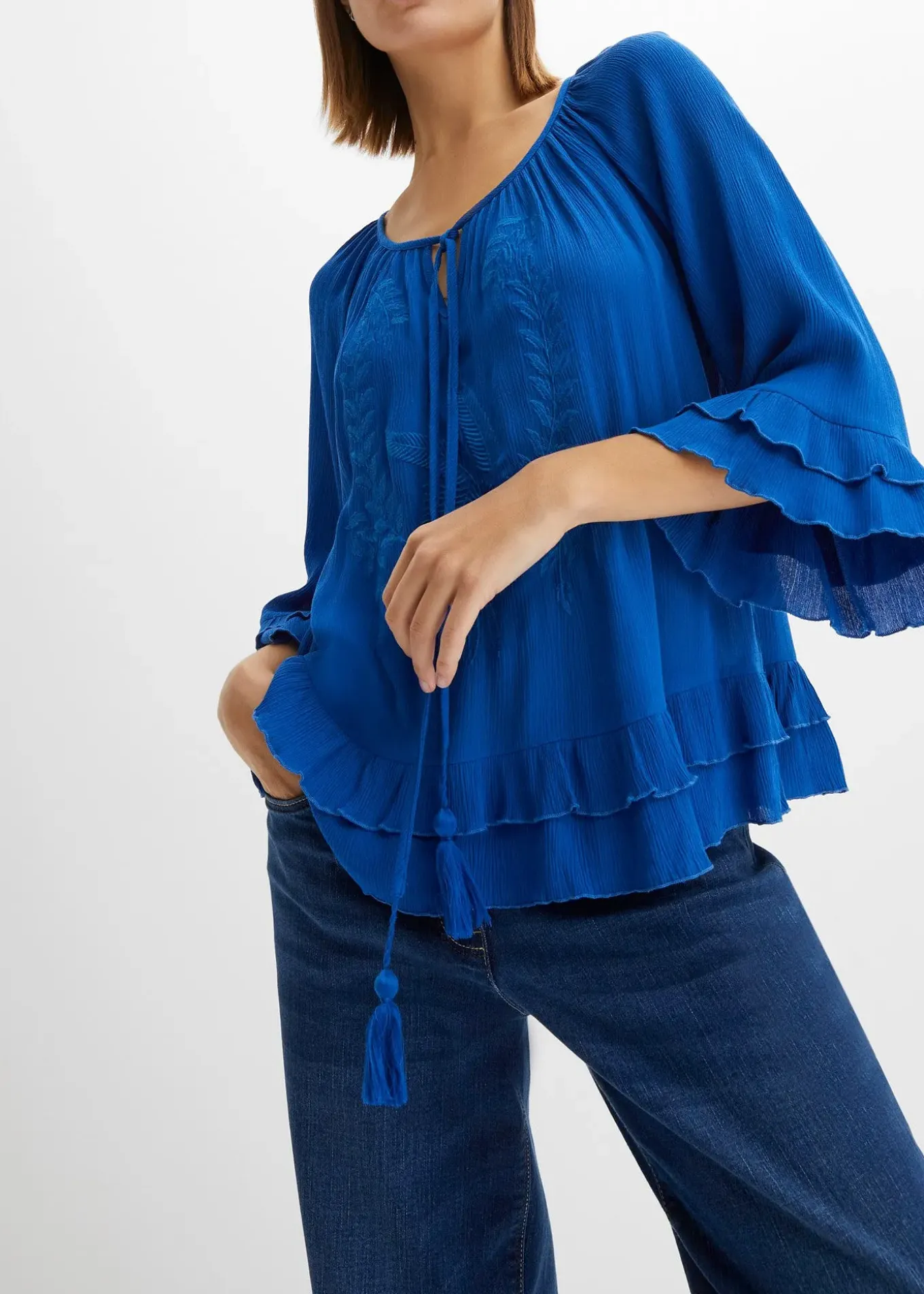 Jolie blouse stylée façon bohème avec broderie décorative ton sur ton. Les volants à la base ajoutent une touche d’originalité. Avec encolure ronde et liens à nouer.