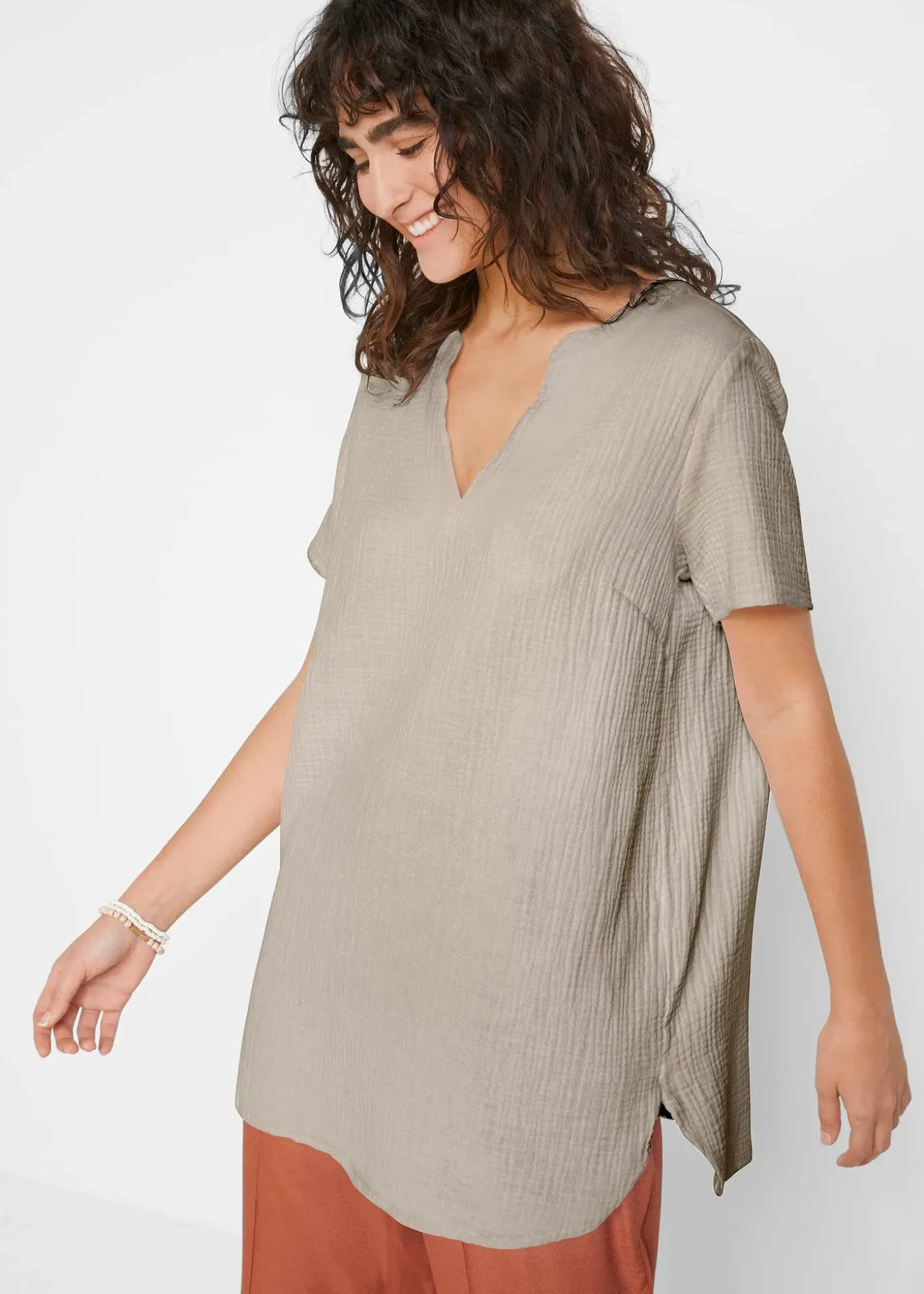 Tunique longue à manches courtes et fentes en gaze de coton