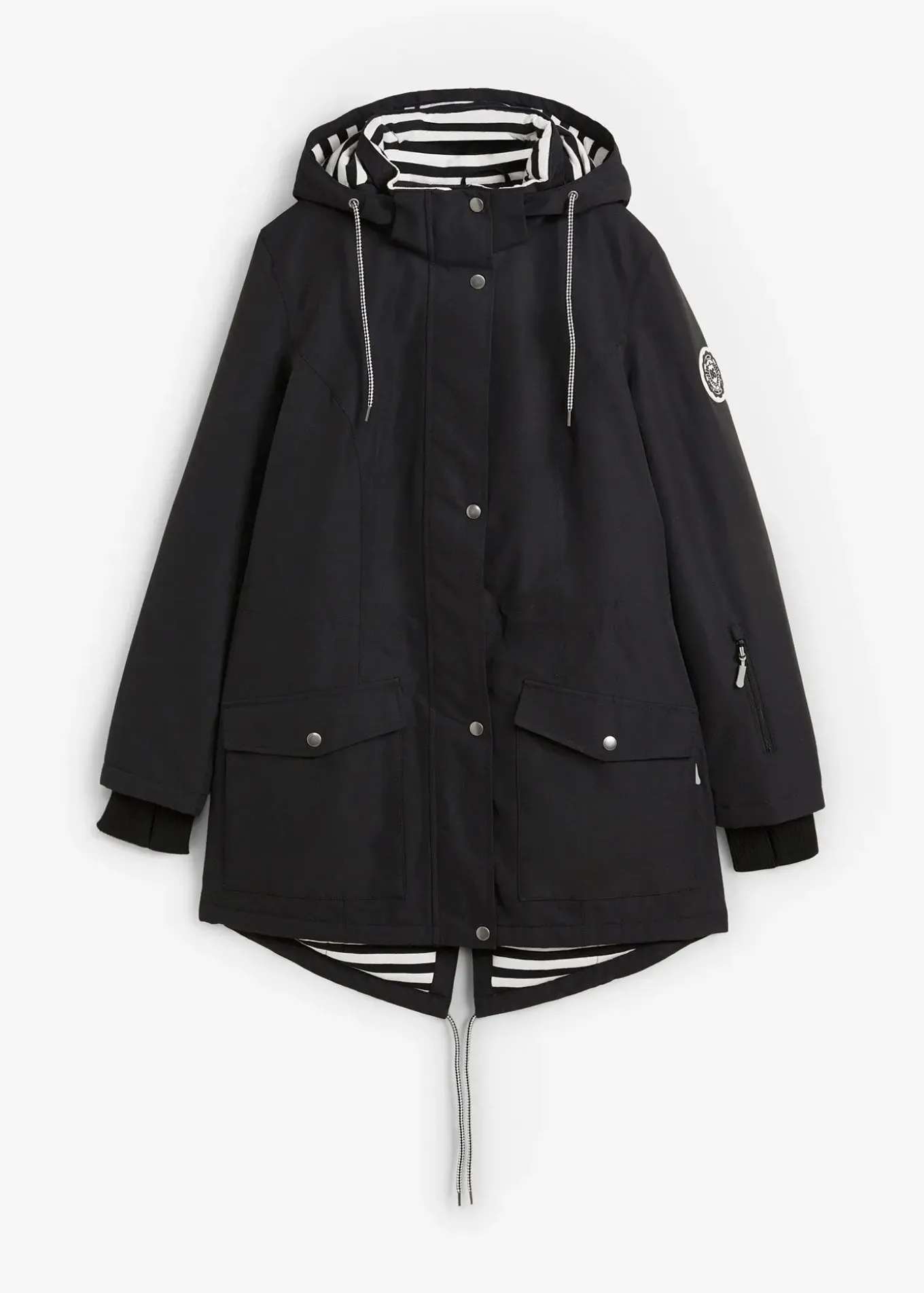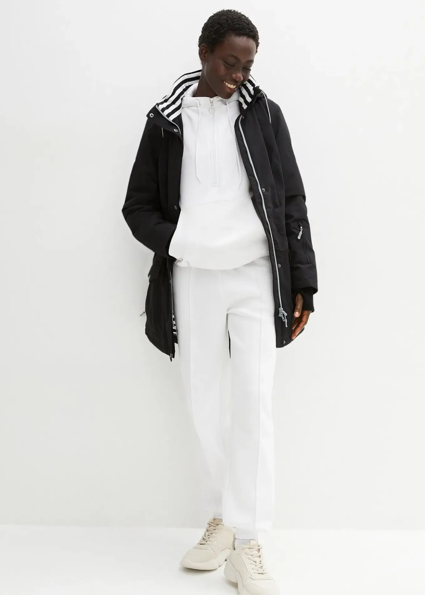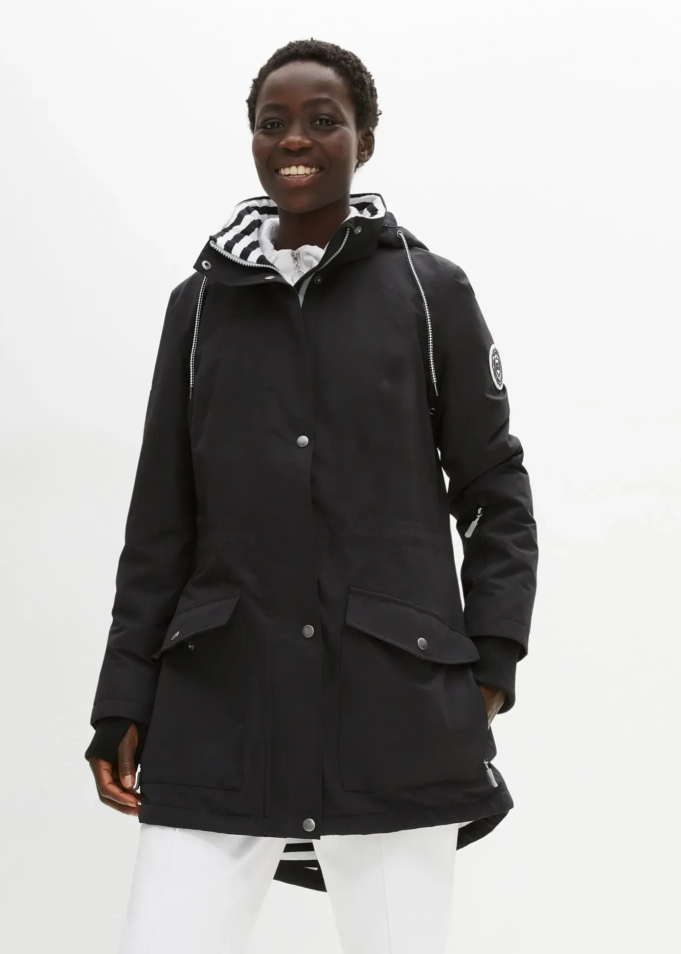 Doublure en single jersey, mitaines, poche intérieure avec passant pour câble d’écouteurs, fermeture zippée double sens, capuche amovible, fente d’aération sous les bras, long. env. 90 cm.