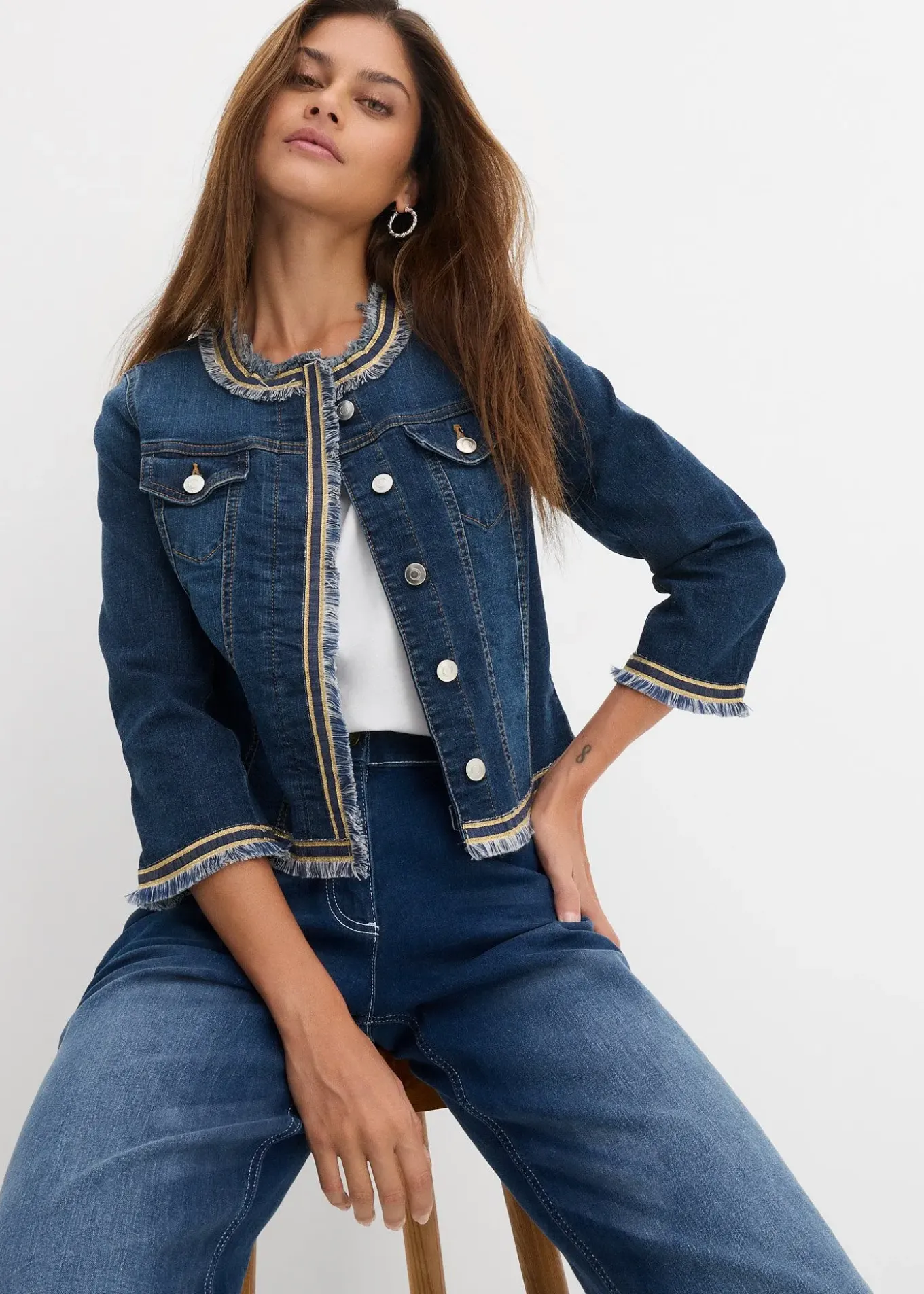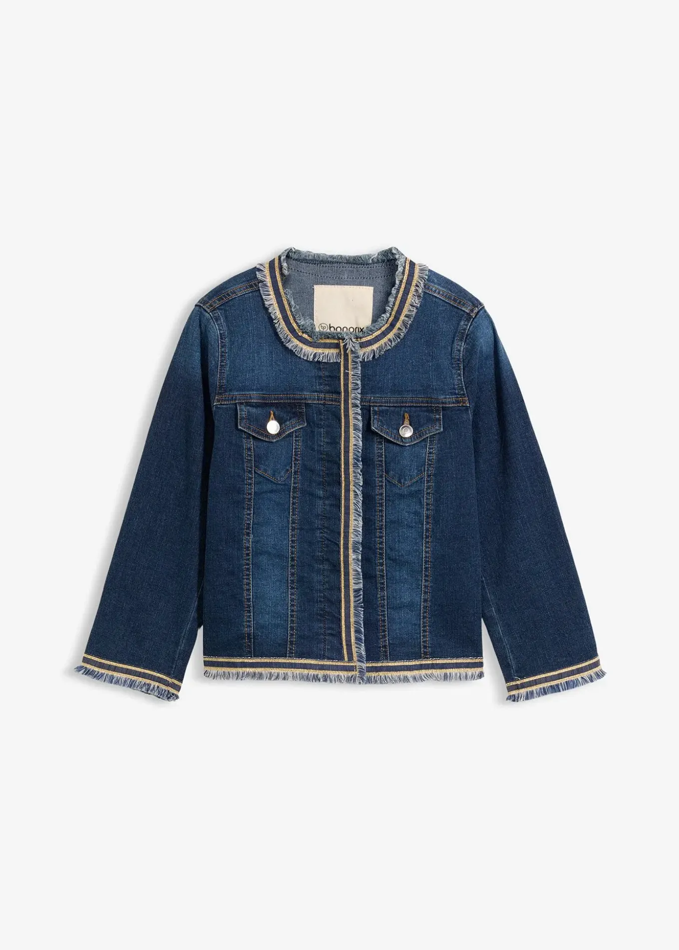 Veste en jean tendance de la marque BODYFLIRT avec franges et galon brillant en bordure et au décolleté. Fermeture par une patte de boutons sous rabat et manches 3/4, long. env. 54 cm.
