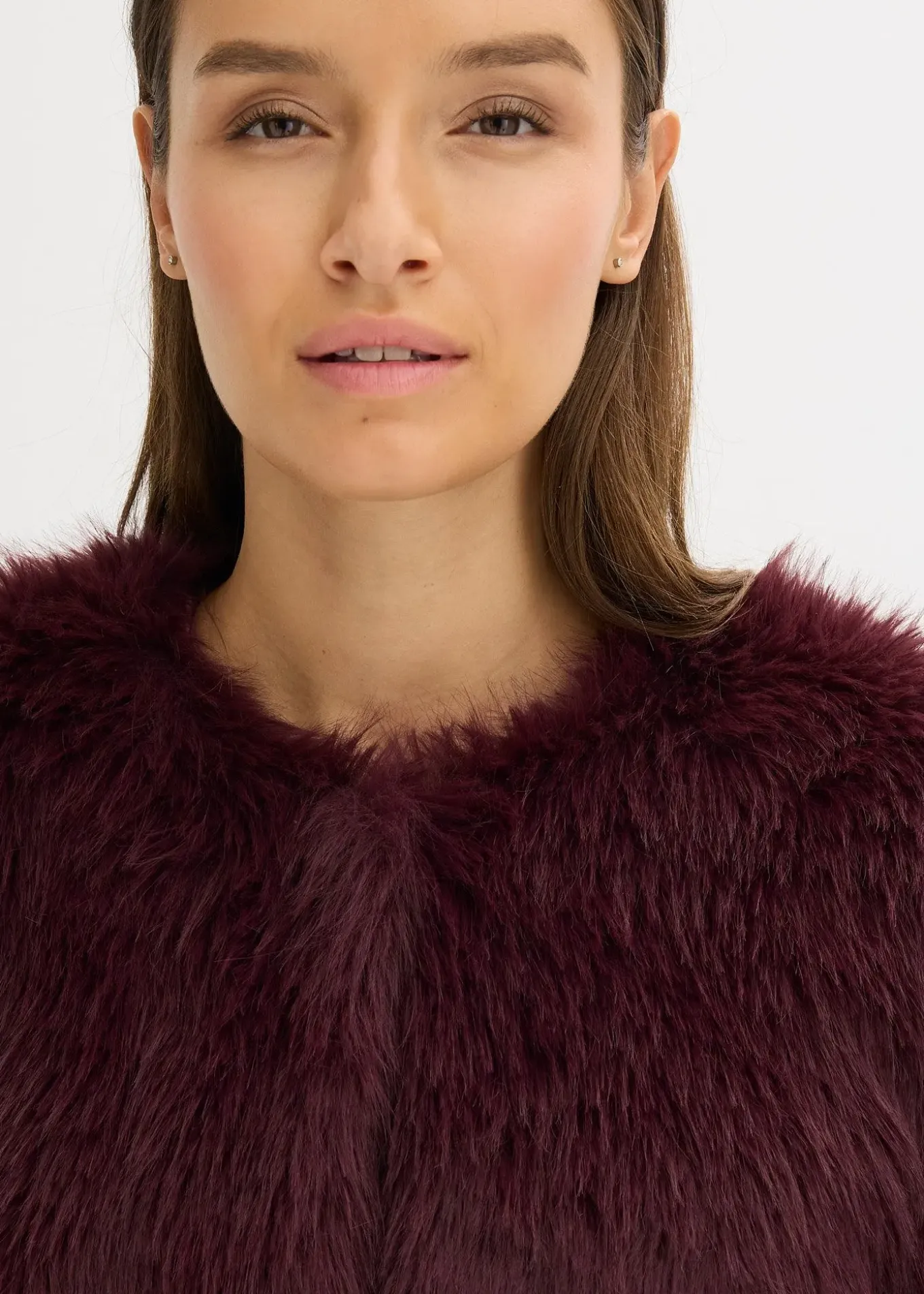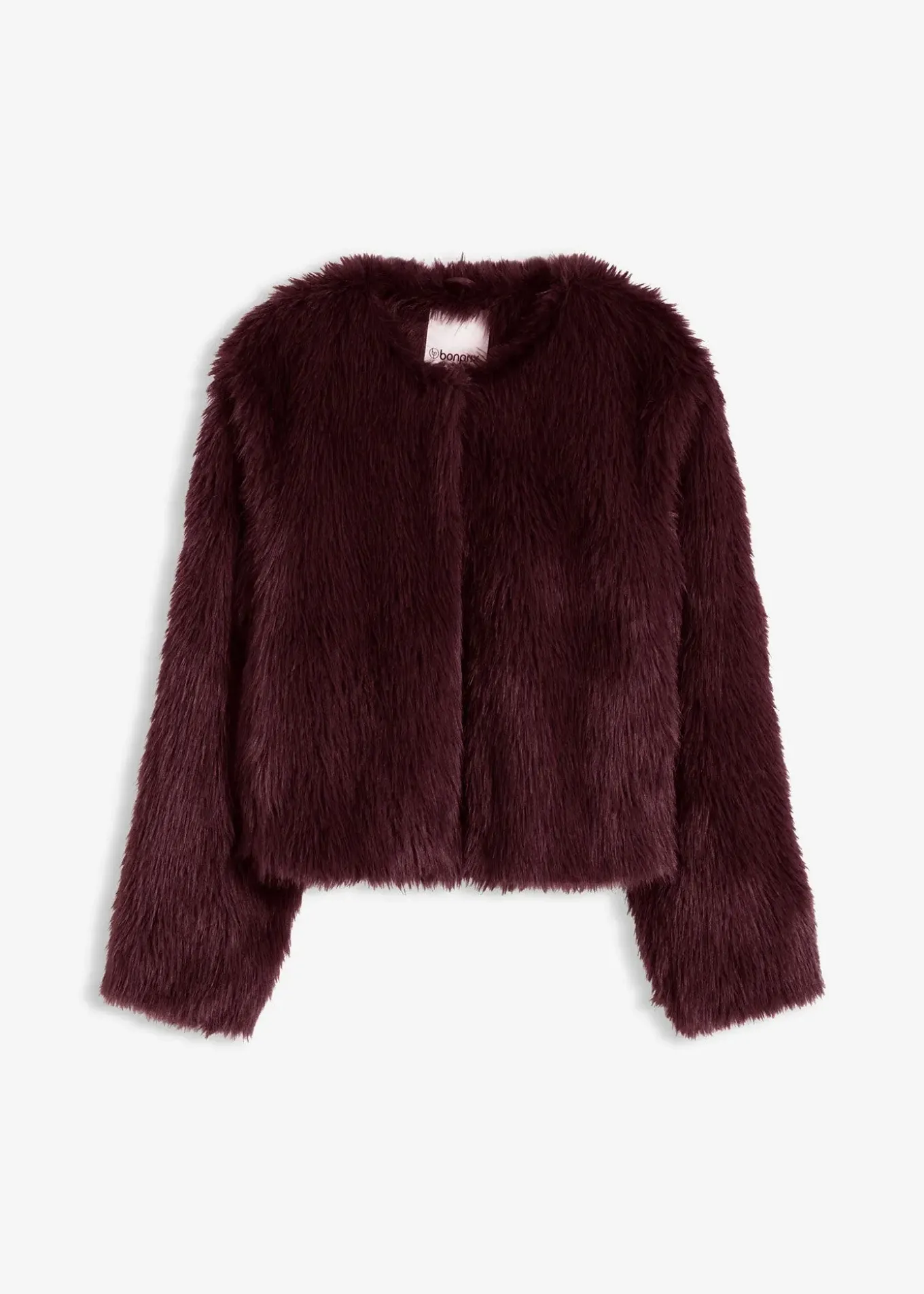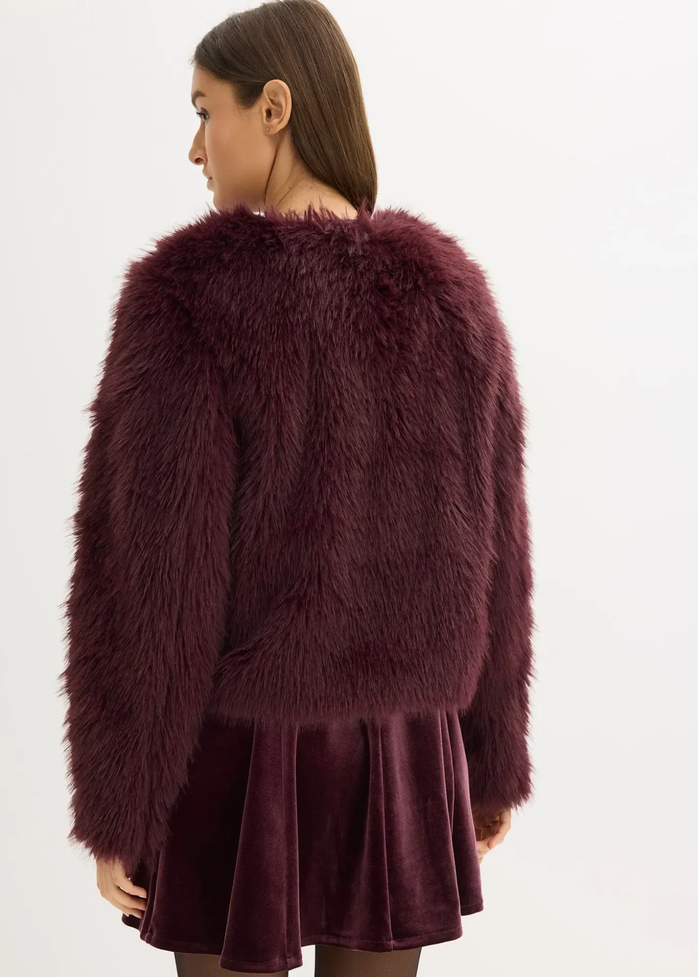 Veste courte et tendance en peluche avec col rond et fermeture par œillets et crochets devant