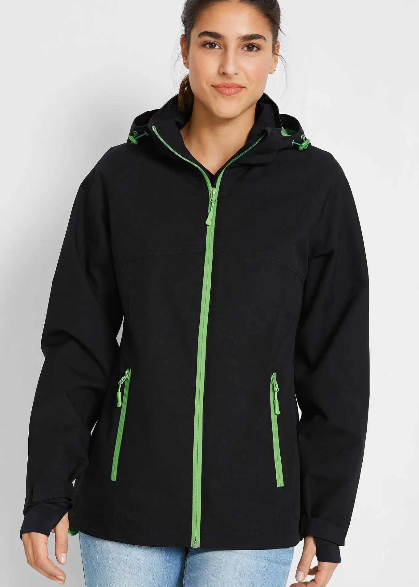 Veste fonctionnelle avec capuche amovible et aération, fermeture zippée avec protège-menton, manches mitaines, colonne d’eau 3000 mm, long. env. 74 cm.
