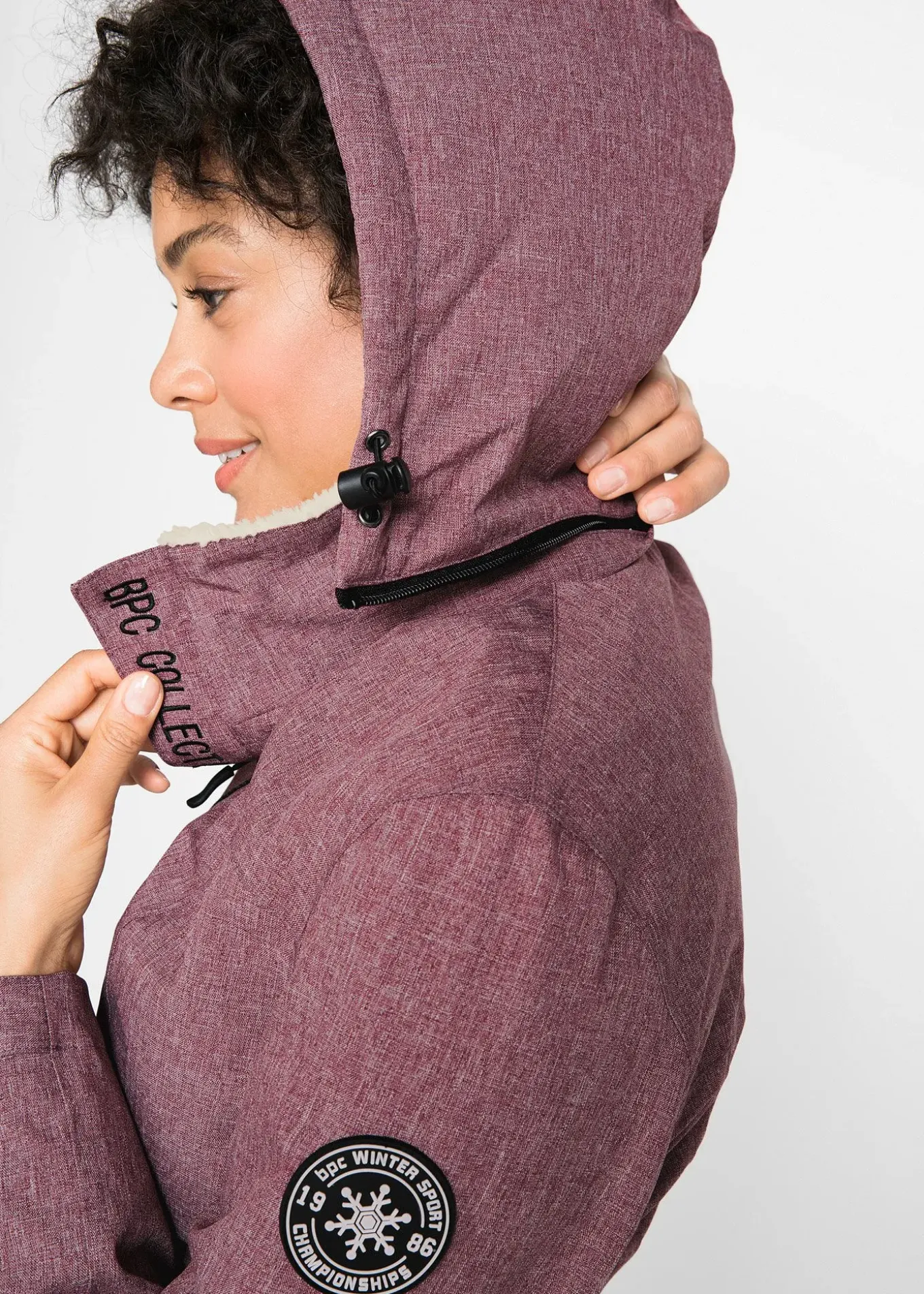 Capuche séparable, doublure en maille polaire style peluche, cordon coulissé à la base pour ajuster l’ampleur, poche intérieure avec passant pour câble d’écouteurs, plus longue au dos, long. env. 74 cm.