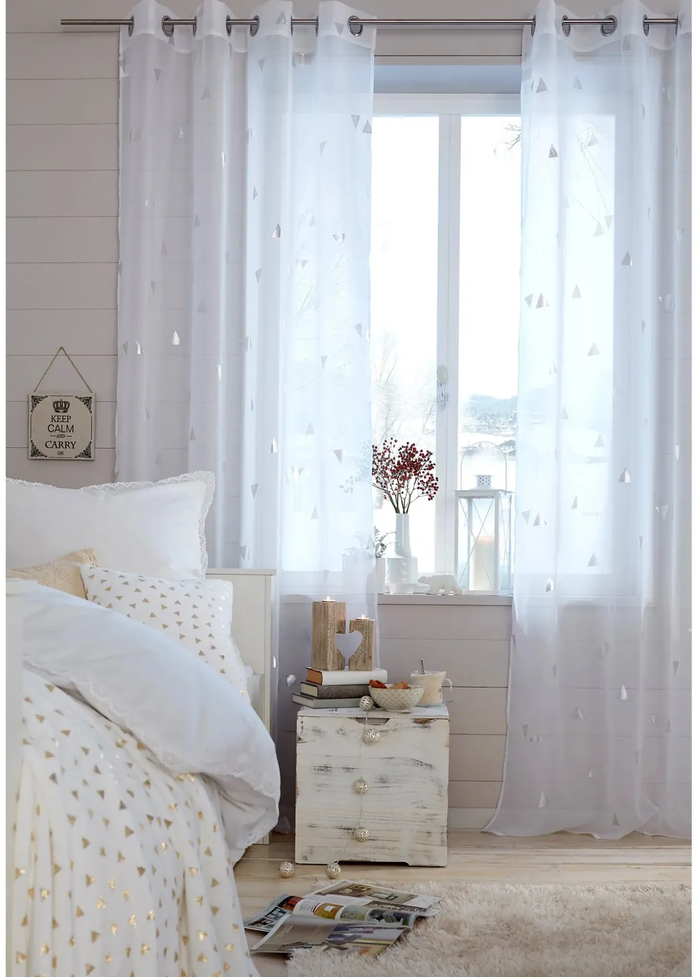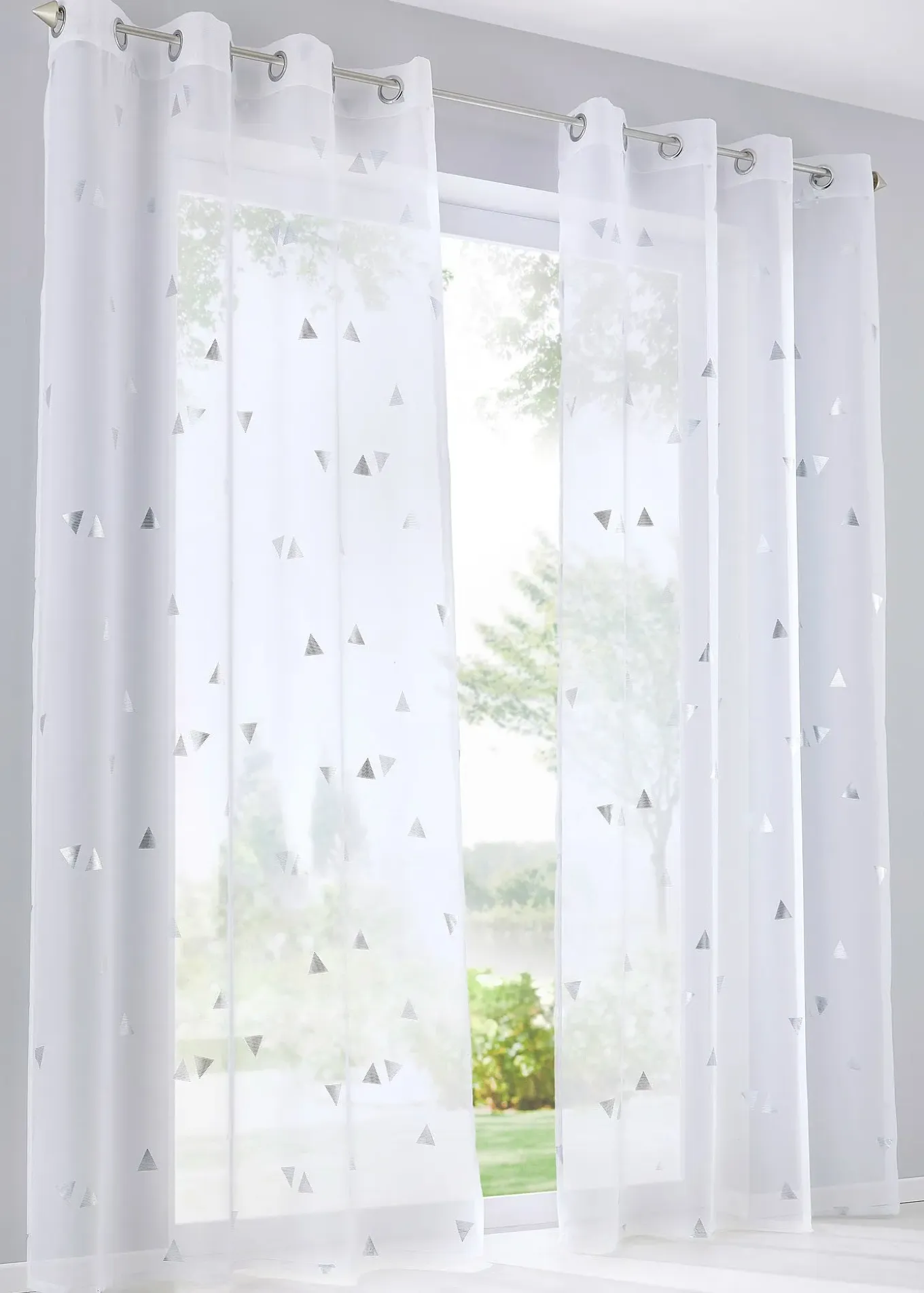 Rideau en voilage transparent avec motifs imprimés de triangles argentés orientés différemment. Les triangles sont composés de petites rayures en film argenté. Une élégance sobre avec une pointe d’originalité, ce voilage se démarque tout particulièrement !