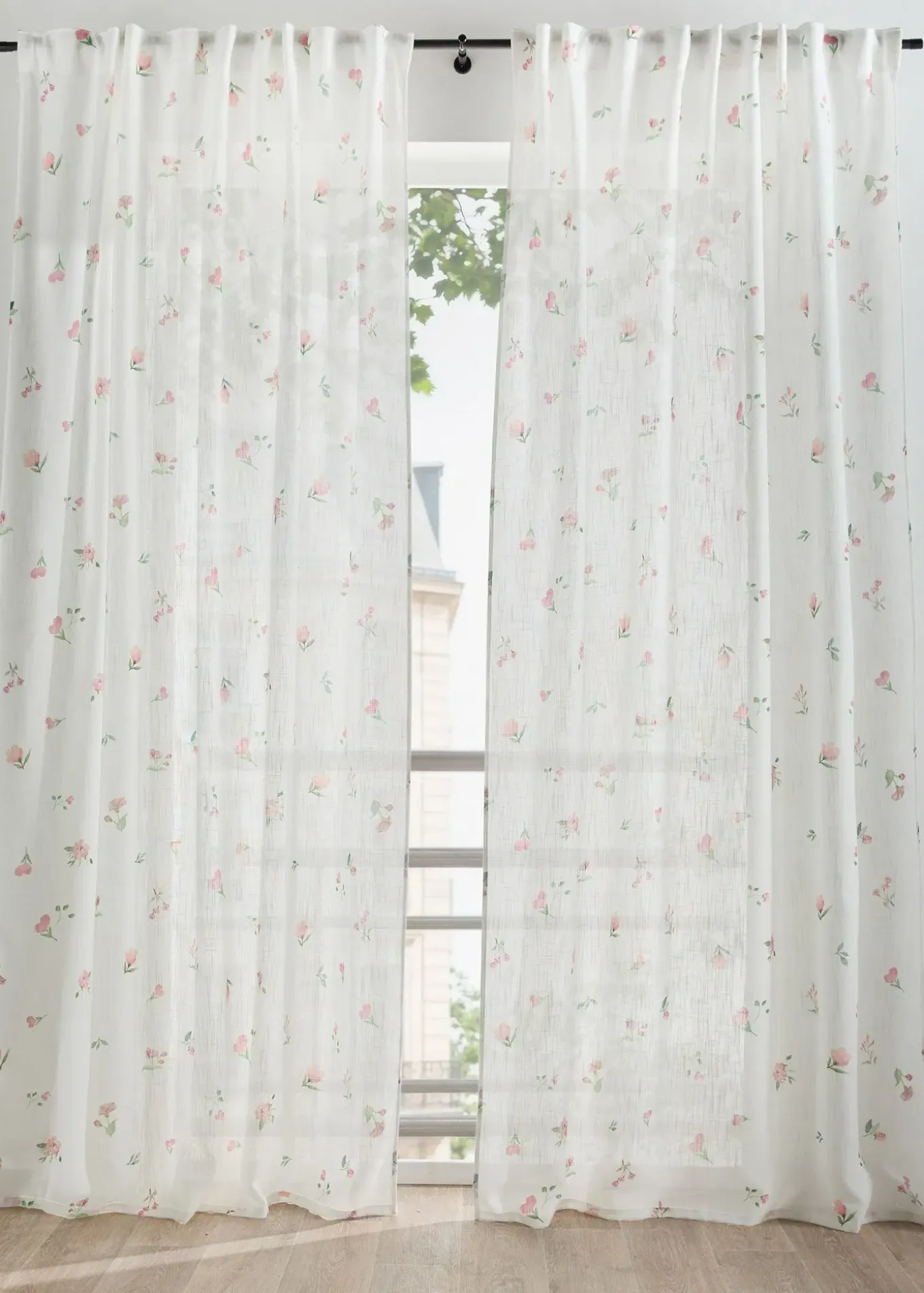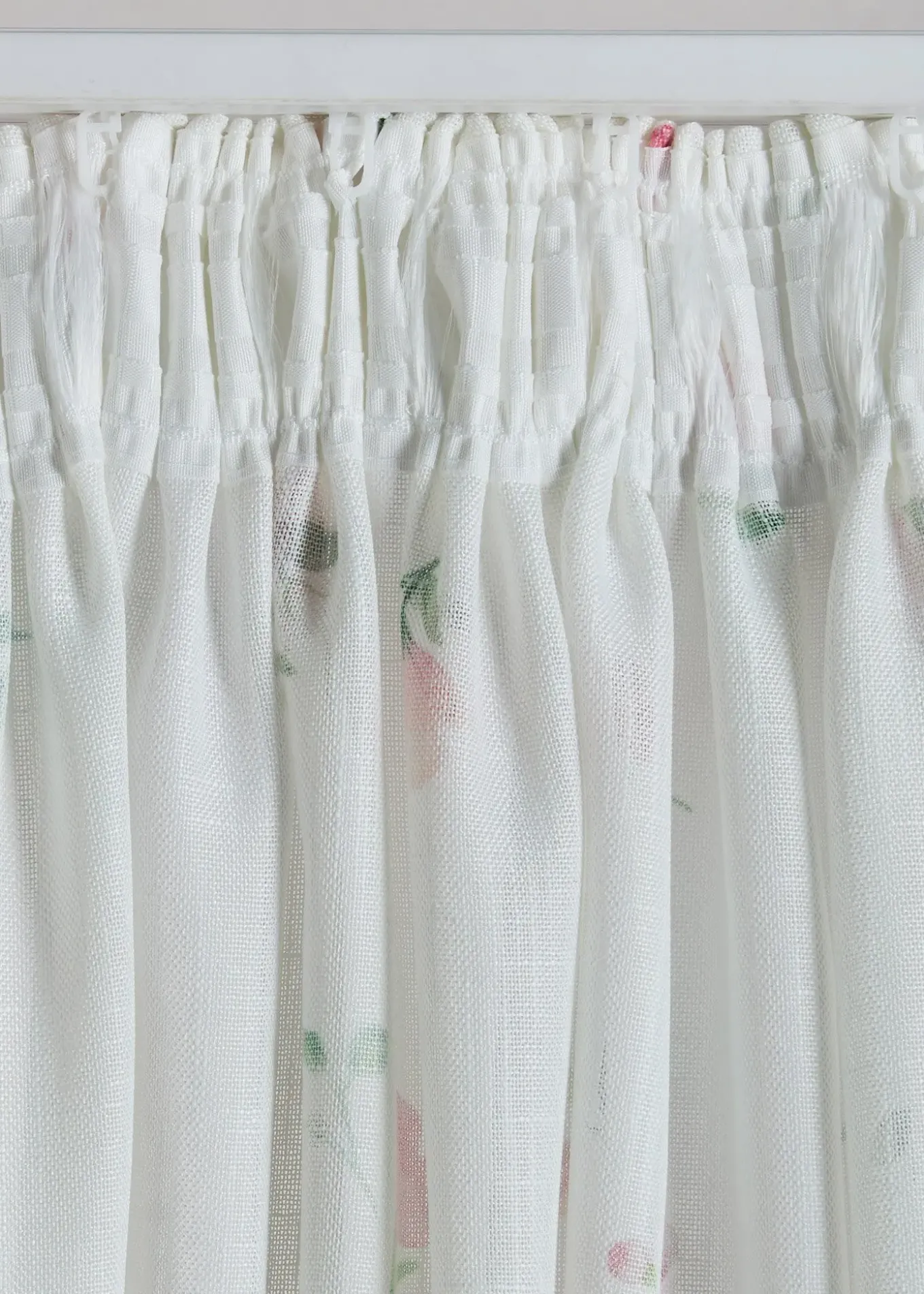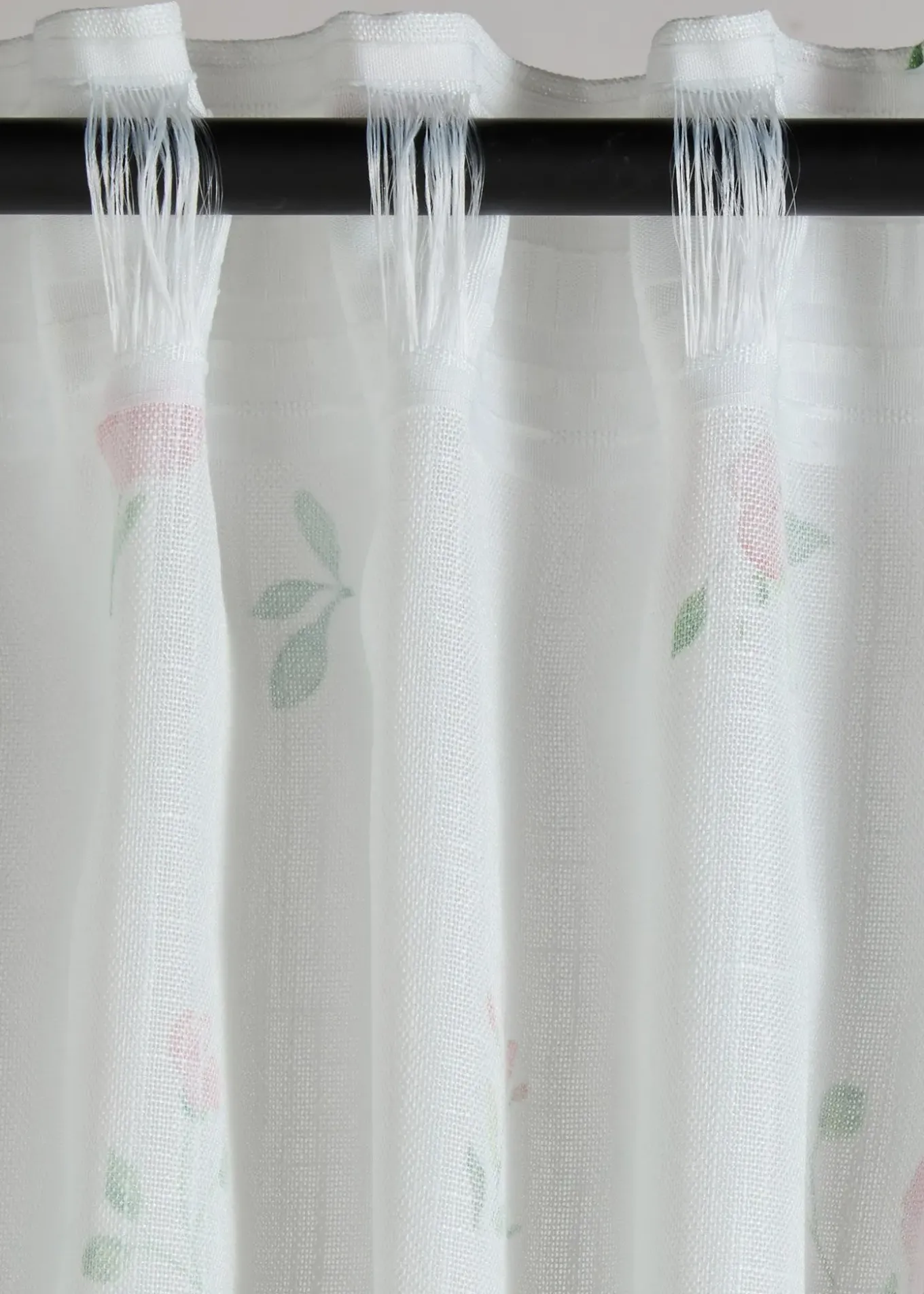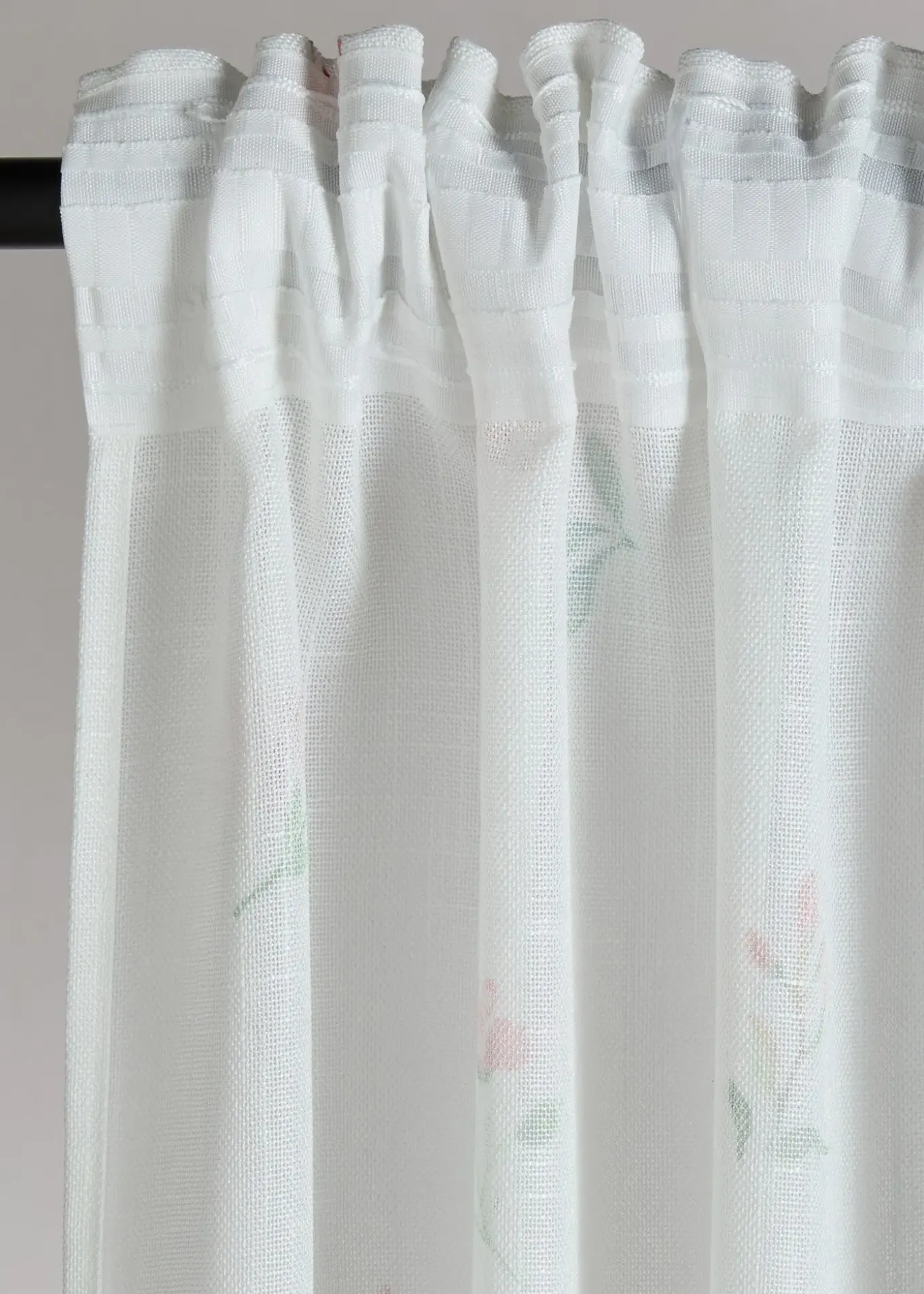 Rideau élégant en tissu légèrement texturé. Orné d’un imprimé discret aux couleurs printanières.