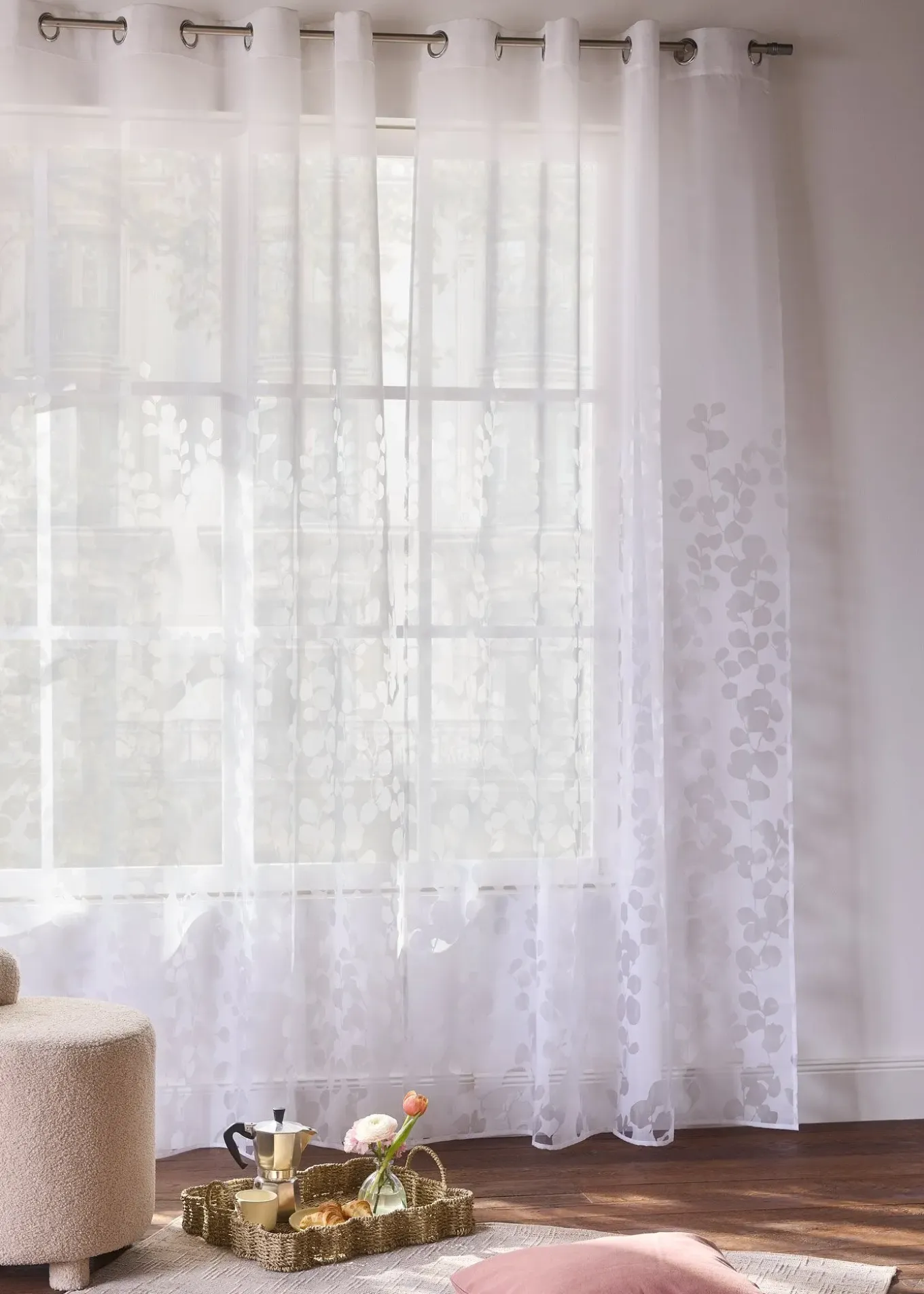 Ce voilage semi-transparent habille vos fenêtres tout en protégeant des regards indiscrets. Son motif simple et élégant en dévoré crée un joli cadre naturel.