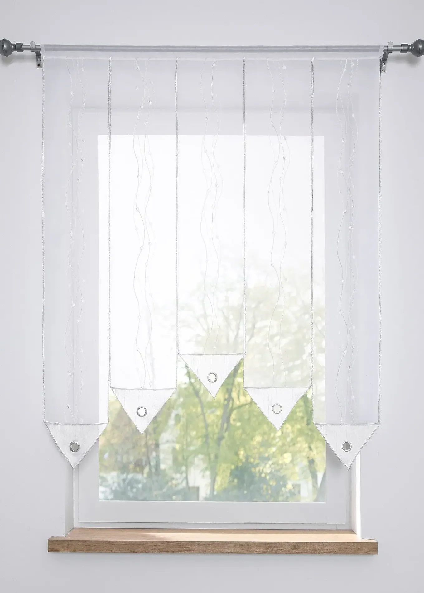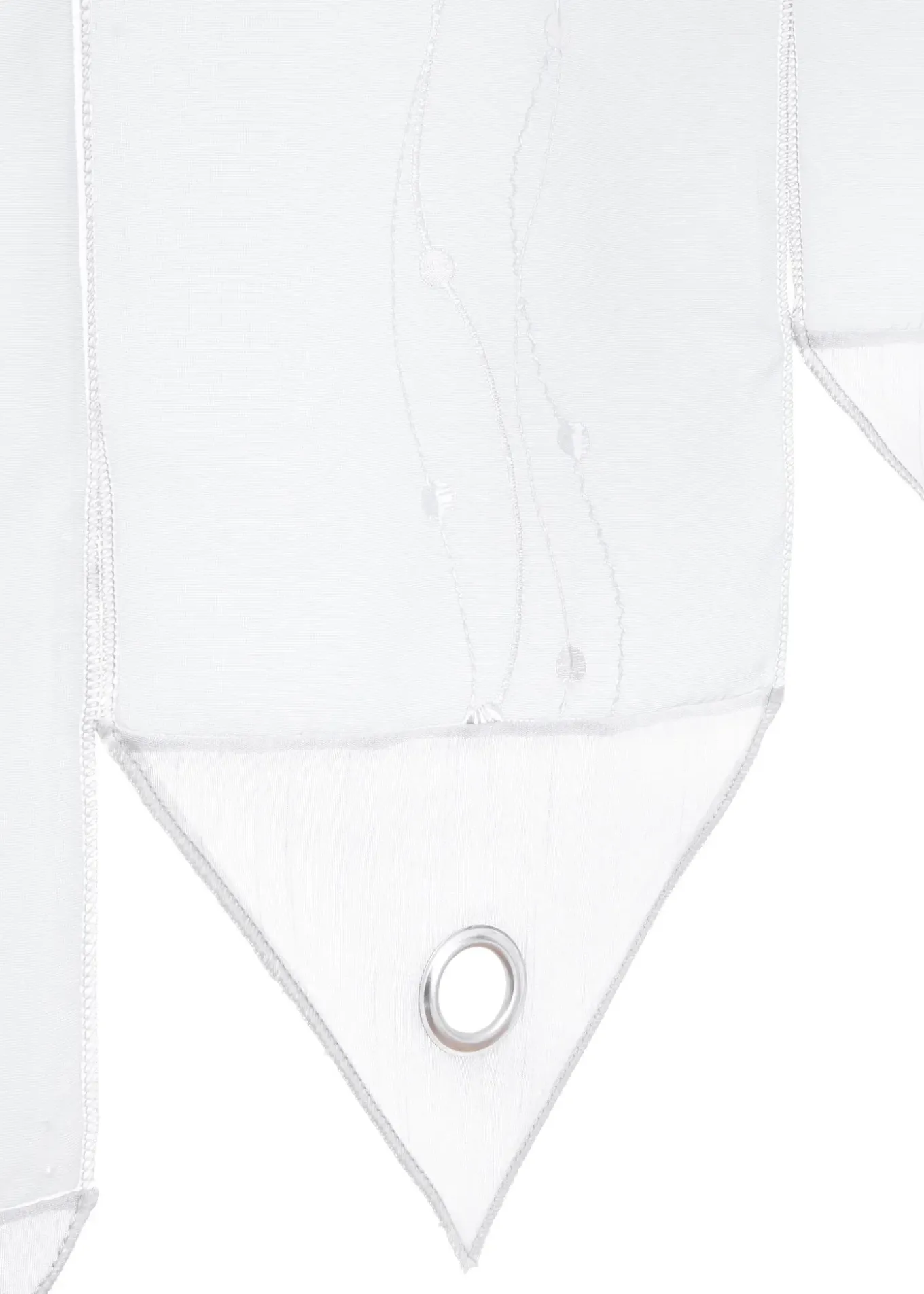 Voilage original composé de bandes de tissu indépendantes, reliées entre elle par la coulisse passe-tringle. Chaque bande de tissu est agrémentée d’une broderie en filigrane, finition pointe triangulaire avec œillet. Une décoration exceptionnelle pour vos fenêtres.